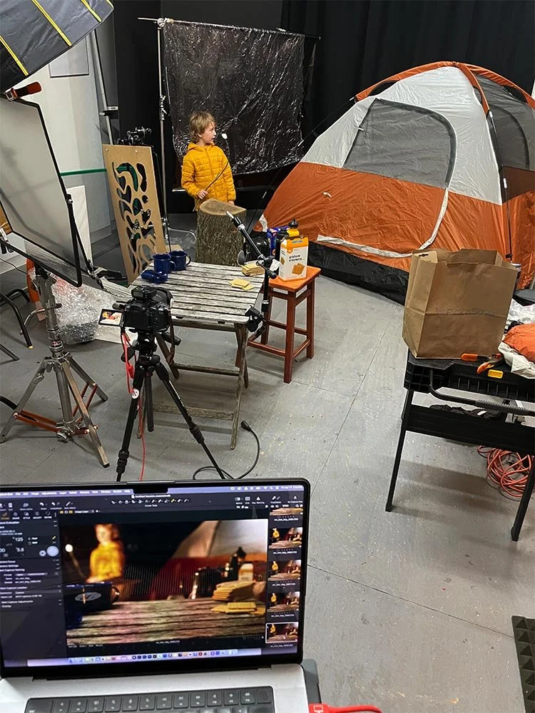 The set was constructed in the studio. My son (in the background) loved having the tent up and an open bag of marshmallows, of course.