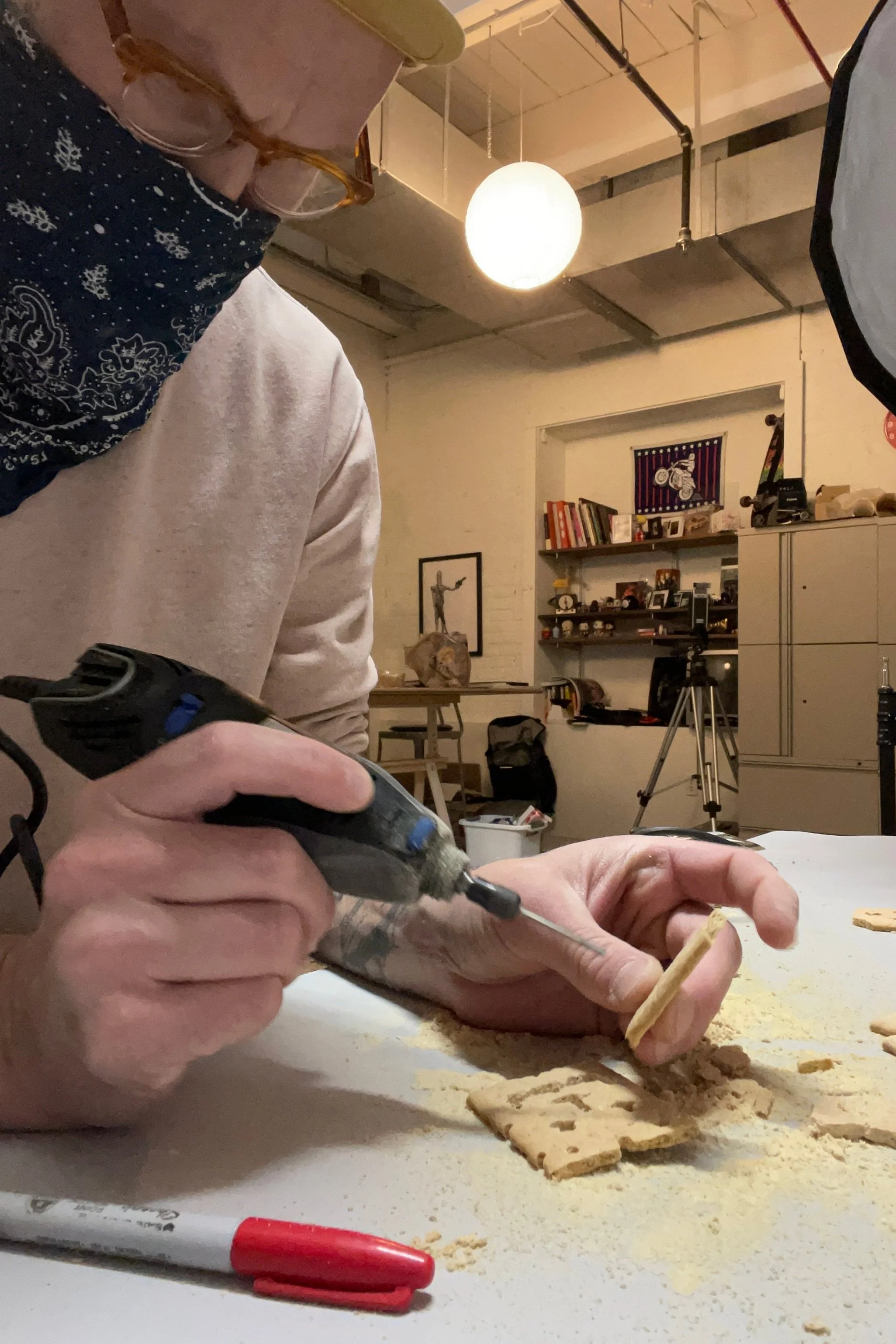 Dremeling Graham Crackers was a first for me and a lot of fun. For the look and feel of the characters and scenes, I took inspiration from the Pacific Northwest and Polynesian culture. (We also just got back from Hawaii.) I used the plastic graham cracker wrapping as the grass skirts. I almost filled the faces in black, but I loved how the light passed through the cutout, giving the cracker characters more life.